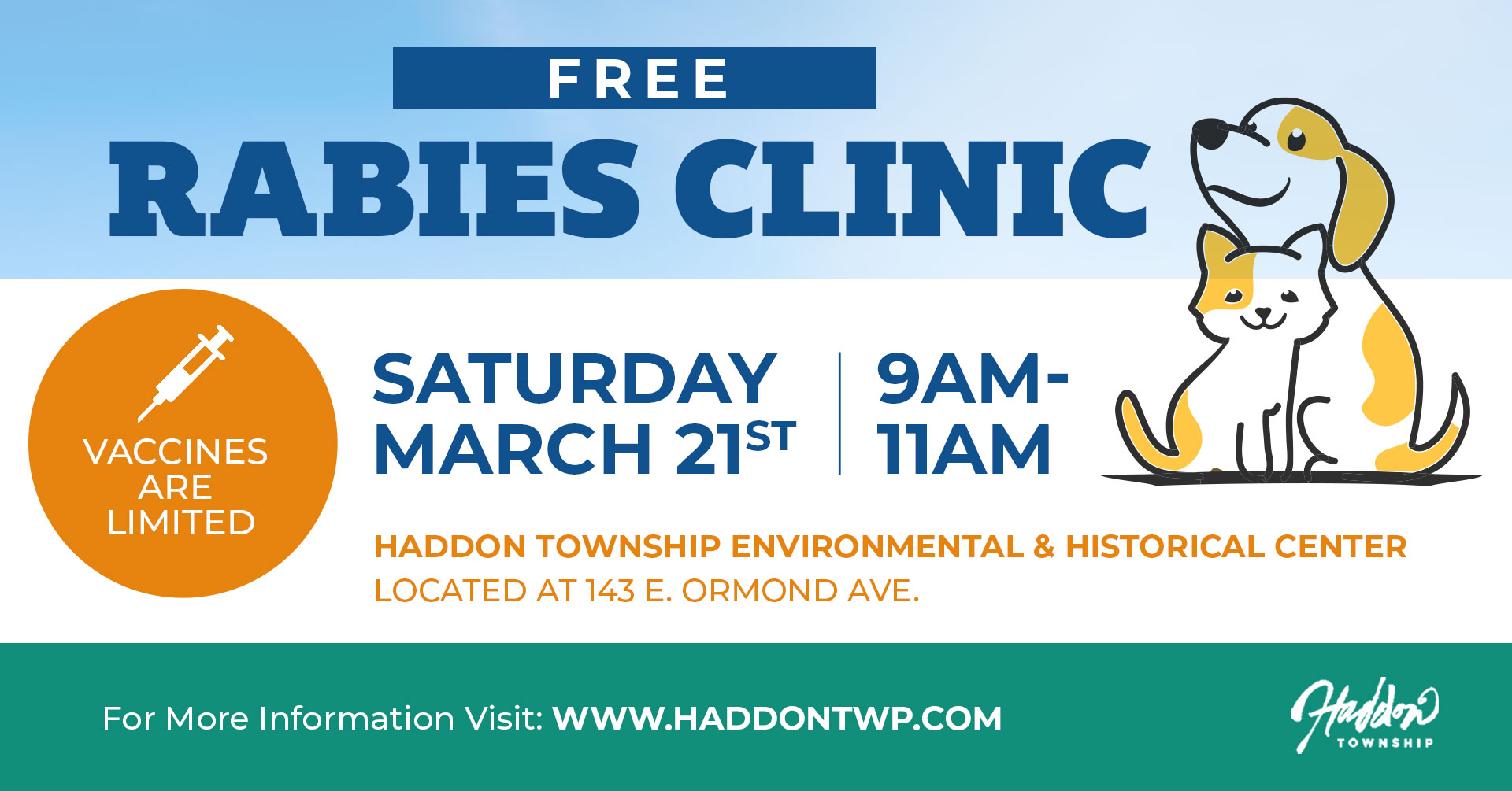 Protect Fido and Fluffy at Haddon Township’s FREE Rabies Vaccination Clinic! Saturday, March 21st at the Department of Public Works Garage located at 143 E. Ormond Ave. Vaccines are limited! For more information, please contact Darlene Alfonsi at dalfonsi@haddontwp.com.