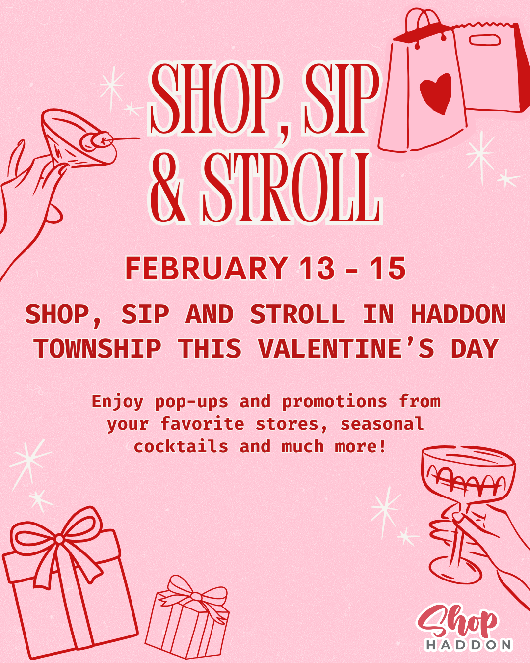 Join us from February 13-15 to Sip, Shop & Stroll throughout Haddon Township! Many businesses in town will be participating by offering last-minute Valentine’s Day gift ideas, special pop-ups, promotions and more!